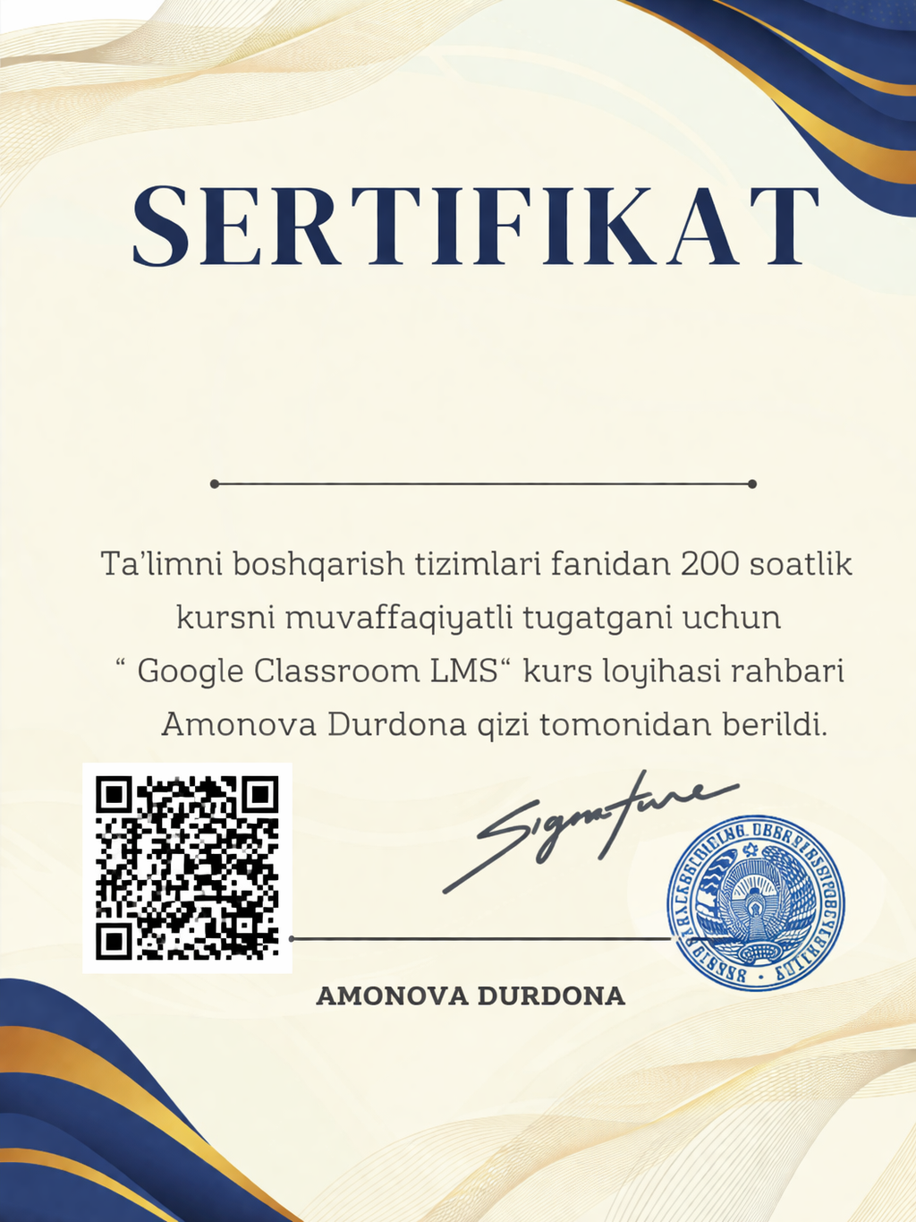 - Учитель: AMONOVA DURDONA OYBEKOVNA